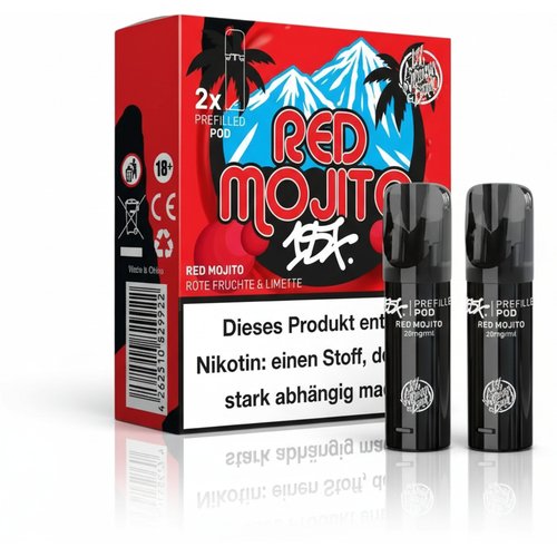 Die 187 Strassenbande Prefilled Pods in der Geschmacksrichtung Red Mojito kombinieren rote Früchte mit Limette. Jede Packung enthält zwei vorbefüllte Pods mit jeweils 2 ml Liquid und einem Nikotingehalt von 20 mg/ml.