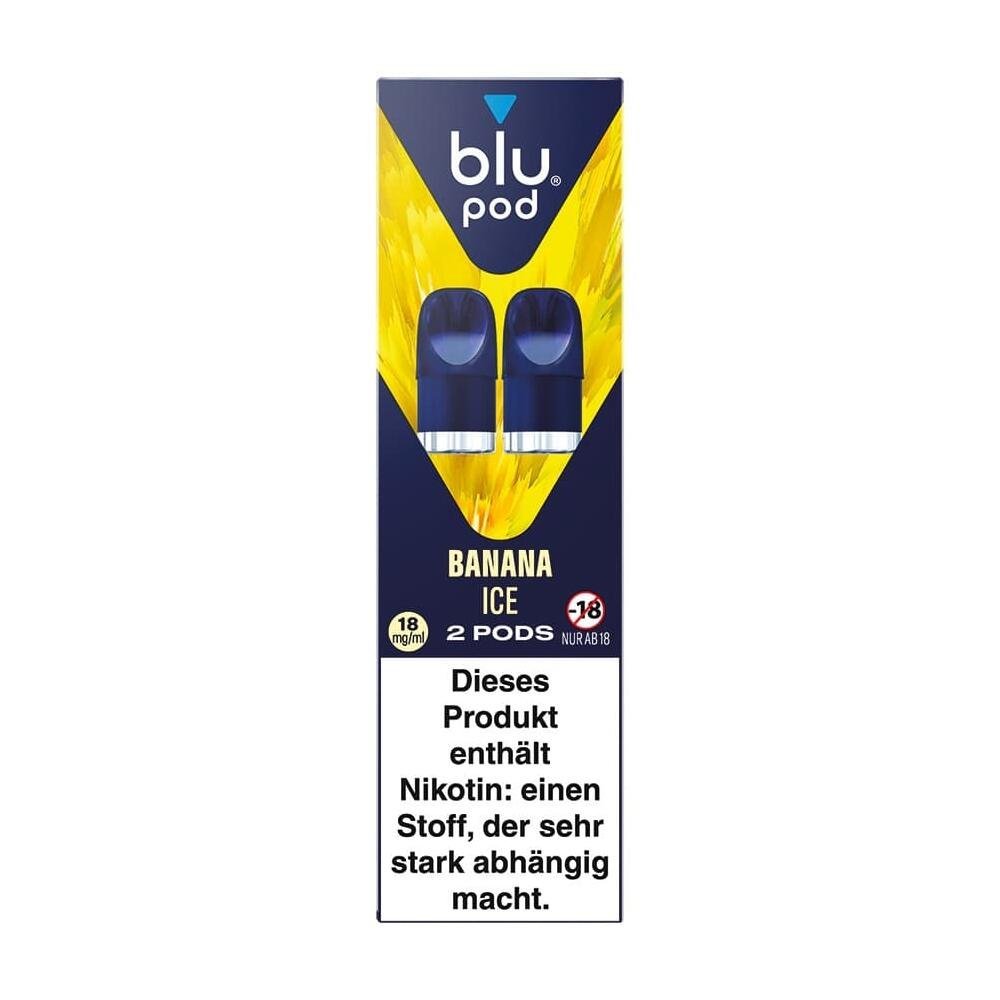 blu Pods Banana Ice (2 ml, 18 mg/ml) – cremig-süße Banane mit frischer Ice-Note. Perfekt für das blu Bar Kit. Jetzt 2er Pack sichern bei dampftbeidir!