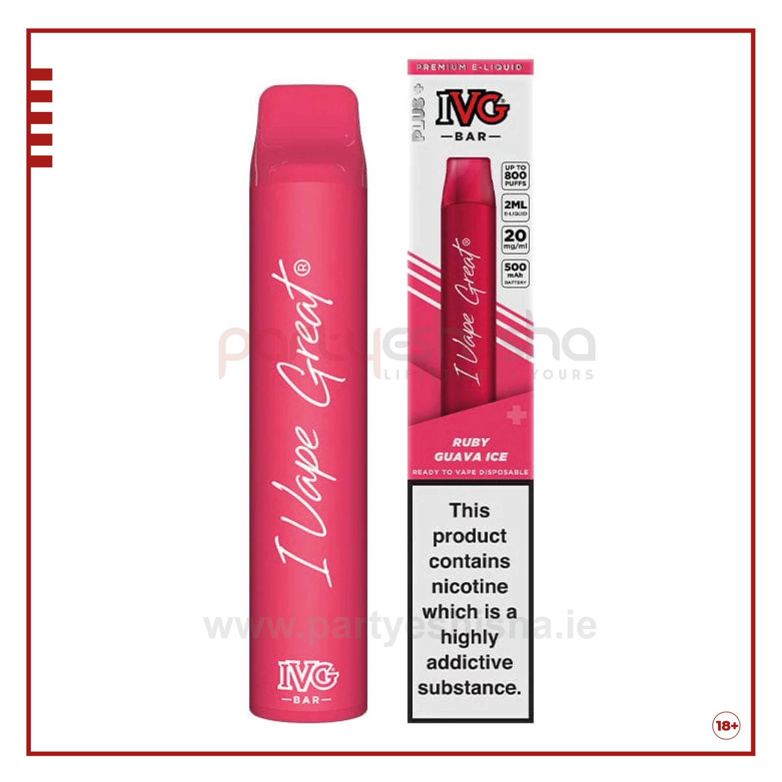 The Ruby Guava Ice IVG Disposable Vape Device is intended for easy vaping. Featuring 2ml of pre-filled 20mg Salt E-Liquid with 500mAh battery and up to 800 puffs.